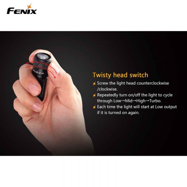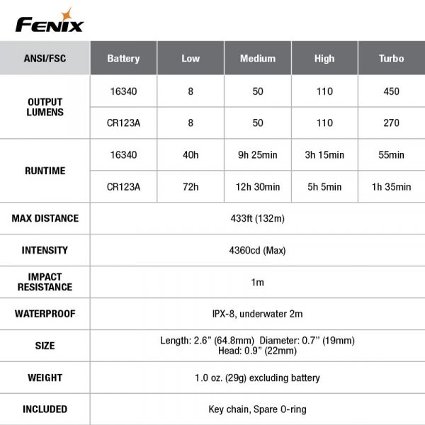 Denna lilla ficklampa låter dig välja fritt mellan två olika batterityper, CR123A och 16340. Påslag samt effektreglering sker enkelt och snabbt genom att man vrider huvudet på ficklampan. E15 är så liten att man kan ha med sig den i fickan överallt, ändå kan den leverera ett ljus som når hela 132 meter bort (@0.25 Lux). Välj CR123A med låg självurladdning om du bara vill ha lampan i beredskap under lång tid, eller 16340 Li-Jon om du behöver maximal kapacitet regelbundet.