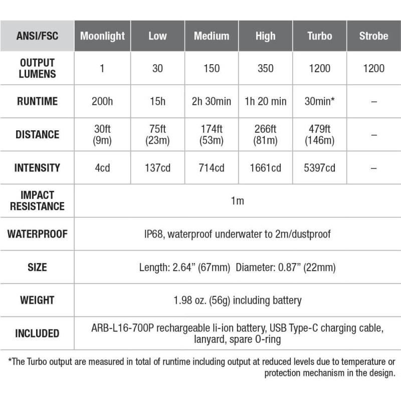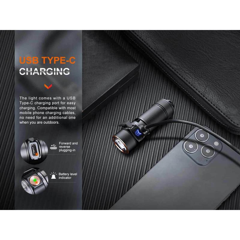 Ficklampan E18RV2.0 laddas enkelt via USB-C när batterinivåindikatorn indikerar att batteriet är lågt. E18RV2.0 är byggd tuff med extra hållbar oxidationsbeständigt flygplansaluminium som kan tappas från 1,5 meter och är vattentät till 2 meter. En magnetisk bakände och en tvåvägs kroppsklämma avrundar funktionerna hos denna fantastiska lilla EDC-ficklampa.