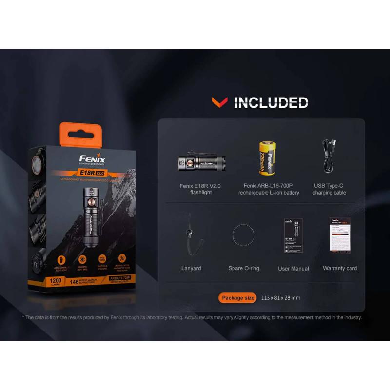 Fenix E18RV2.0 är en ultrakompakt EDC (every day carry) ficklampa med enastående prestanda för en så här liten ficklampa. E18RV2.0 drivs av ett inkluderat 16340 Li-Jon-batteri och avger maximalt 1200 lumen på ett avstånd på 146 meter. Den sidoplacerade strömbrytaren styr sex effektlägen, inklusive ett månskensläge som är lämpligt för närliggande uppgifter. Undvik oavsiktlig aktivering med både ett elektroniskt och fysiskt lås av strömavbrytaren.