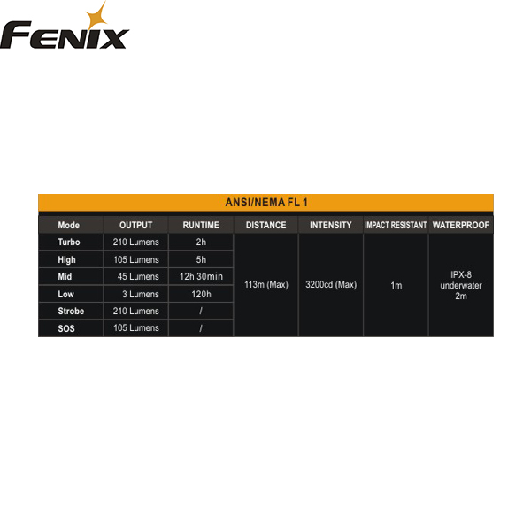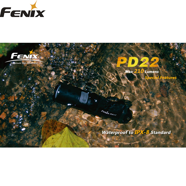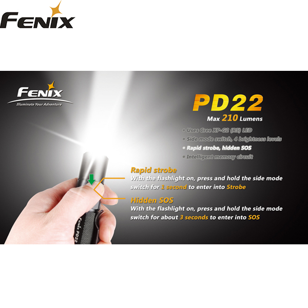 Fenix PD22 är en högintensiv ficklampa med sido-knapp. Den har fyra st. ljusnivåer, strobe funktion och ett dolt SOS-läge. PD22 ger 210 lumen intensivt ljus och kan lysa upp till 120 timmar!