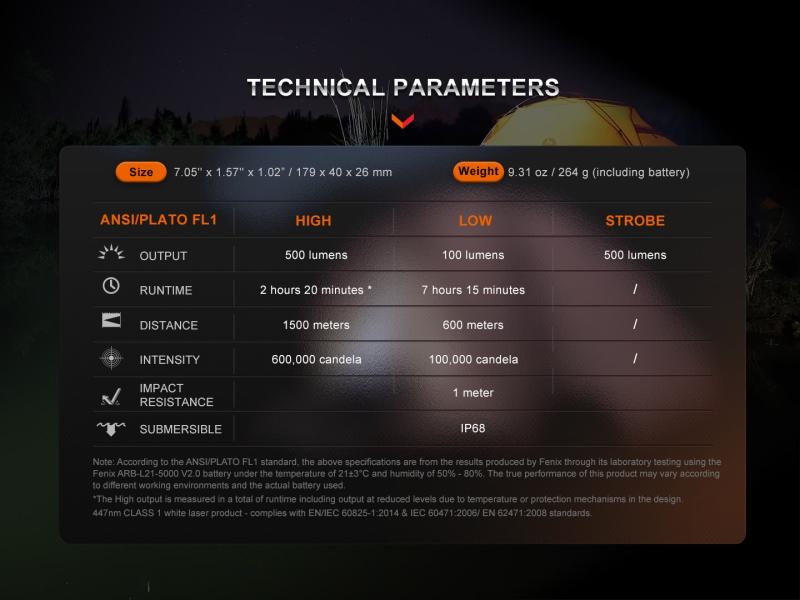 Fenix HT30R är en vit laser ficklampa med en helt otrolig räckvidd. Den har en klass 3B laser som går genom en kristall, vilket skapar ett spektrum av vitt ljus som med 500 lumens räcker hela 1 500 meter (!). Laserljuset är mer fokuserat än vanligt LED-ljus, med betydligt mindre spilljus runt om.