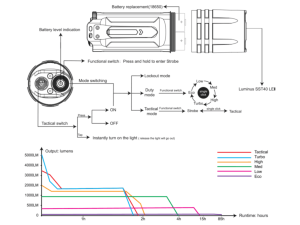 - Drivs av två 18650 uppladdningsbara litiumjonbatterier eller fyra CR123A litiumbatterier (batterier ingår ej)