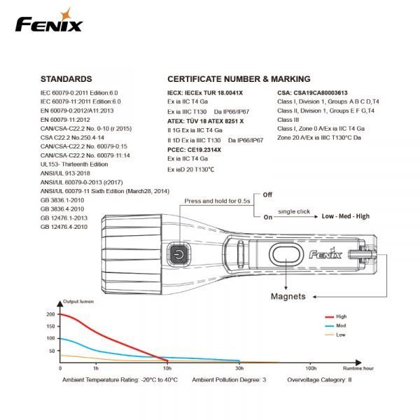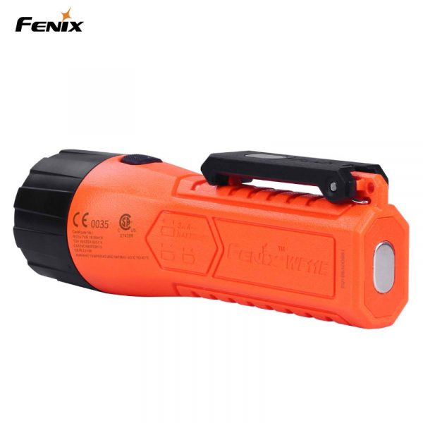 WF11E är en säkerhetsficklampa utformad för användning i områden med risk för explosioner, exklusive gruvor. Certifierad av IECEx, ATEX och CSA för användning i zon 1 och zon 2 där det finns potentiellt explosiv gas, och zon 21 och zon 22 i atmosfärer med brännbart damm. Ficklampan drivs med tre medföljande AAA-batterier och har tre effektlägen som kan leverera upp till maximala 200 lumen. WF11E har även magneter i bältesclipet och gaveln, vilket gör den enkel och säker att fästa på diverse metallytor. Plastkroppen är slagsäker och vattentät ner till 1m. Denna lampa är en arbetshäst för den som ofta jobbar i brandfarliga miljöer.