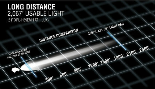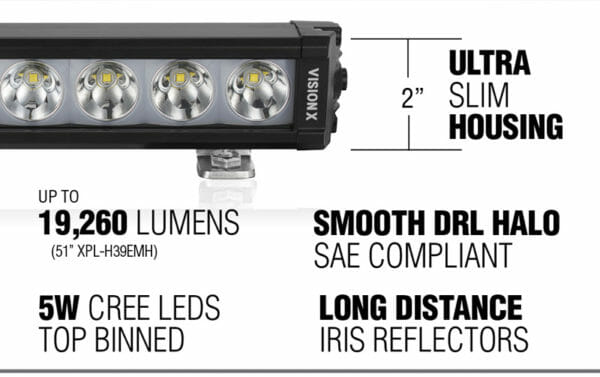 XPL low profile är Vision X senaste LED ramp med ett extra slimmat lamphus som bara är 45mm högt förutom ute på kanterna där är den 51mm. Trots den låga profilen har XPL riktigt bra tryck i ljuset med bra längd och en hel del bredd detta tack vare den välarbetade IRIS reflektorn och Cree's senaste top BIN 5W diod. Ljusbilden kallas spot men är tvådelad; en del nära ger bra bredd i närområdet med ca 70 graders spridning samt en del slungas iväg på håll med ca 10 graders spridning. Detta resulterar i att den ger bättre bredd nära där bilens helljus inte är tillräckligt brett samt ökad längd på ljuset på håll. XPL 40" lyser vid 1 lux 637m (1274m vid 0,25 lux).