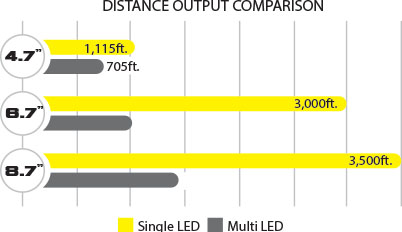 Till skillnad från Cannon Single LED som jobbar med maximal räckvidd så jobbar Cannon Multi LED med maximal råstyrka och har omatchade 18000 råa lumen ljusmängd med en ljusbild mittemellan flood och spot. Önskas bredare ljusbild går det att använda combo eller eurofilter på dessa. Ett tips är att blanda med Single LED 8,7" i mitten för längd och Multi LED på sidorna för fyllnad.